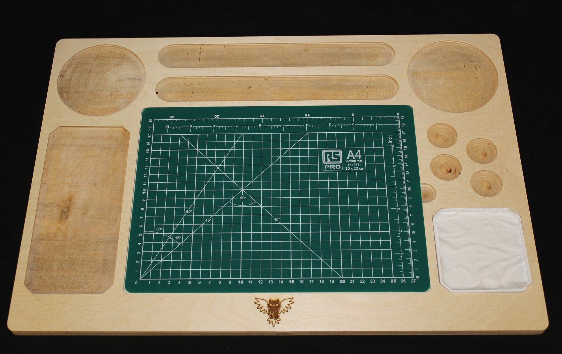 La Paint Station di Owlwood comprende, oltre al piano in legno, un foglio da taglio formato A4 e un vassoio in plastica bianca.