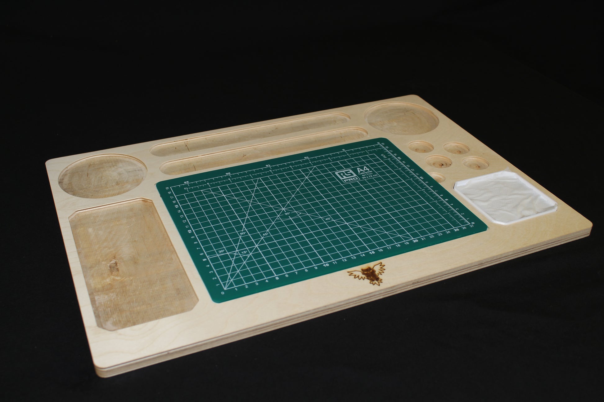La Paint Station di Owlwood è progettata per poter organizzare il materiale da pittura e proteggere il tuo tavolo. Realizzata interamente in multistrato di betulla può contenere fino a 26 colori (diametro vani superiori 35mm - diametro quadruplo porta colori destro 33mm) comodamente organizzati sulla tua stazione di pittura. Centralmente vi è un tappetino da taglio formato A4 removibile e lavabile separatamente. Vi sono poi due vani porta bicchiere e un vano con un vassoio in plastica bianca, utile per esempio per una wet palette. È possibile riporre i propri pennelli nel grande vano posto a sinistra o in uno dei due vani porta colori superiori.